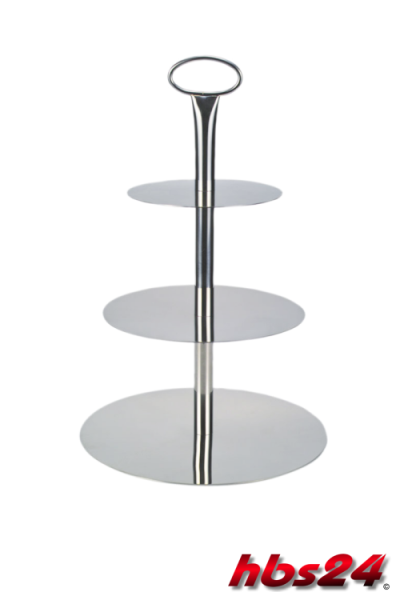 - Der Blickfang für jeden Tisch und jedes Buffet ! Eine schlichte, klassische Etagere mit drei Ebenen,passend zu jeder Tischdekoration. Gebäck, Konfekt, Häppchen oder Obst können so dekorativ serviert werden. 3-stöckig, Höhe ca. 30 cm, ø Platten ca. 12, 16 und 20 cm.