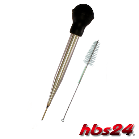 Das Set bestehend aus Edelstahl-Saugrohr mit Silikonbalg, Injektionsnadel und Reinigungsbürstezum Verfeinern des Bratguts von innen und außen
