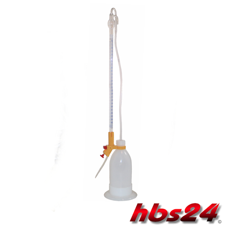 Diese Titrierbürette nach Schilling besteht aus einer 500 ml Kunststoffflasche, einem flexiblen Silikonschlauch und einer kalibrierten Glasbürette mit automatischer Nullpunkteinstellung und kontrollierter Abflussgeschwindigkeit. Mit Hilfe der Einstellschraube können Sie den Abflussstrahl regeln, von fließend bis eintropfend. Drücken Sie die Kunststoffflasche zusammen um die Bürette zu füllen. Durch die automatische Nullpunkteinstellung fließt die überschüssige Flüssigkeit in die Flasche zurück.