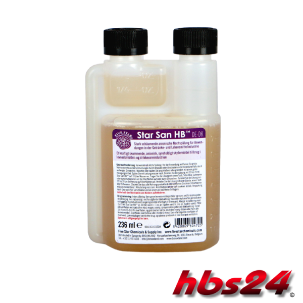 Spülen Sie gut mit Leitungswasser nach. Bereiten Sie eine Lösung mit 15 bis 25 ml Star San HB™ auf 10 Liter Wasser vor. Tragen Sie die Lösung mit einem Tuch, Schrubber, Schwamm oder durch Aufsprühen oder Eintauchen auf die Oberflächen auf. Sprühen Sie die Lösung aus 15 bis 20 cm Entfernung auf Oberflächen auf. Verteilen Sie die Lösung mit einer Bürste, einem Tuch oder Schwamm. (Decken Sie dazu alle Nahrungsprodukte ab oder entfernen Sie diese.) Oberflächen müssen mindestens 1 Minute lang nass sein. Anschließend an der Luft trocknen lassen. Verpackung nach Gebrauch fest verschließen und an einem gut belüfteten Ort lagern.